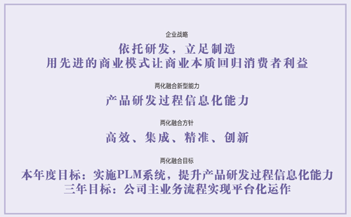 在信息化條件下,兩化融合是企業(yè)獲得可持續(xù)競(jìng)爭優(yōu)勢(shì)的必由之路,是提高企業(yè)經(jīng)濟(jì)效益的有效手段,關(guān)系到企業(yè)的研發(fā)設(shè)計(jì)高效管控能力、生產(chǎn)過程管控能力以及品牌服務(wù)全生命周期管控能力,涉及到企業(yè)管理和運(yùn)營的方方面面。