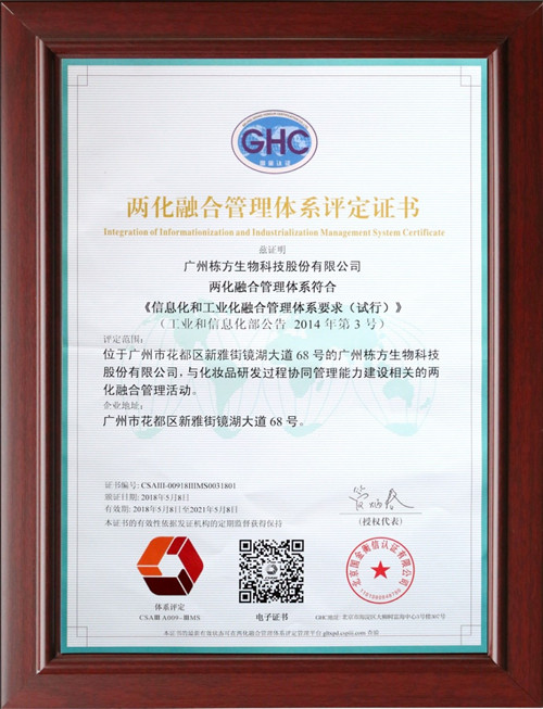 5月8日,棟方股份兩化融合管理體系順利通過專家組審核,獲得頒發(fā)兩化融合管理體系評定證書,成為率先通過該體系評估審核的化妝品研發(fā)制造企業(yè)。棟方股份成功實現(xiàn)兩化融合,企業(yè)競爭力將會得到進一步的提升,在管理水平和工作效率方面得到明顯改善,必會更好服務(wù)于客戶和市場。