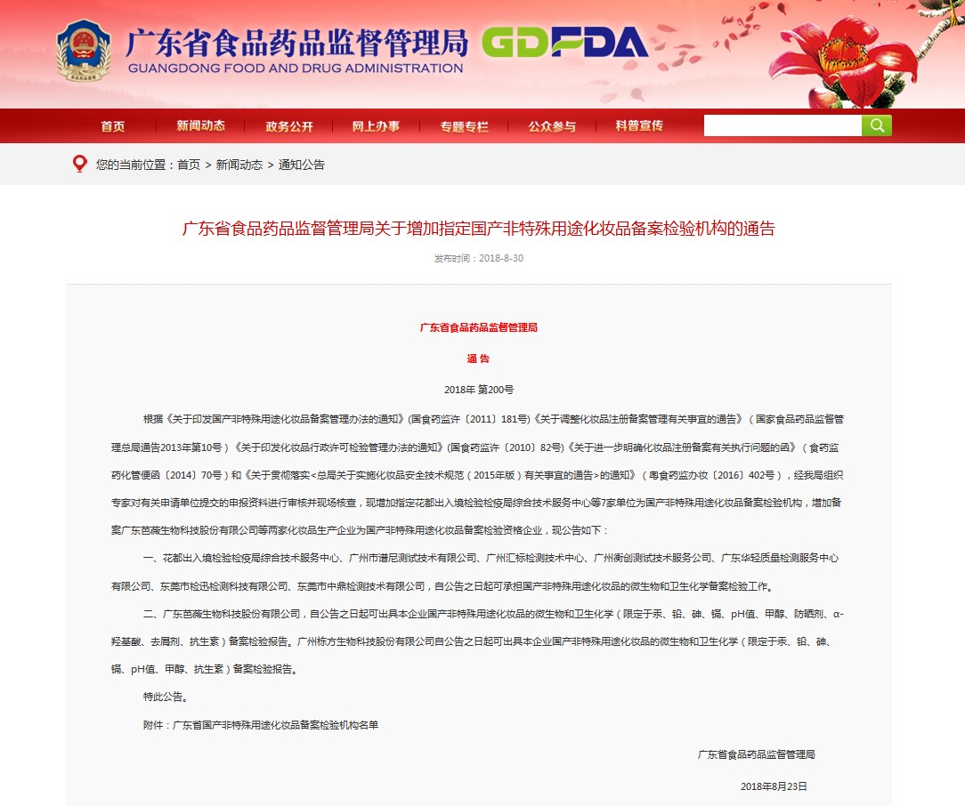 8月23日,廣東省食品藥品監(jiān)督管理局組織專家對(duì)有關(guān)申請(qǐng)單位提交的申報(bào)資料進(jìn)行審核并現(xiàn)場(chǎng)核查,增加備案廣州棟方生物科技股份有限公司為國(guó)產(chǎn)非特殊用途化妝品備案檢驗(yàn)資格企業(yè),廣州棟方生物科技股份有限公司自公告之日起可出具本企業(yè)國(guó)產(chǎn)非特殊用途化妝品的微生物和衛(wèi)生化學(xué)(限定于汞、鉛、砷、鎘、pH值、甲醇、抗生素)備案檢驗(yàn)報(bào)告。詳細(xì)內(nèi)容請(qǐng)見《廣東省食品藥品監(jiān)督管理局通告》(2018年第200號(hào))